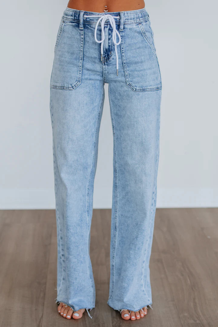 Upgrade your casual denim game with these ultra-comfortable high-waisted drawstring wide-leg jeans. Designed for laid-back days and effortless style, they feature a soft, light blue wash with subtle fading for a lived-in, vintage feel.
