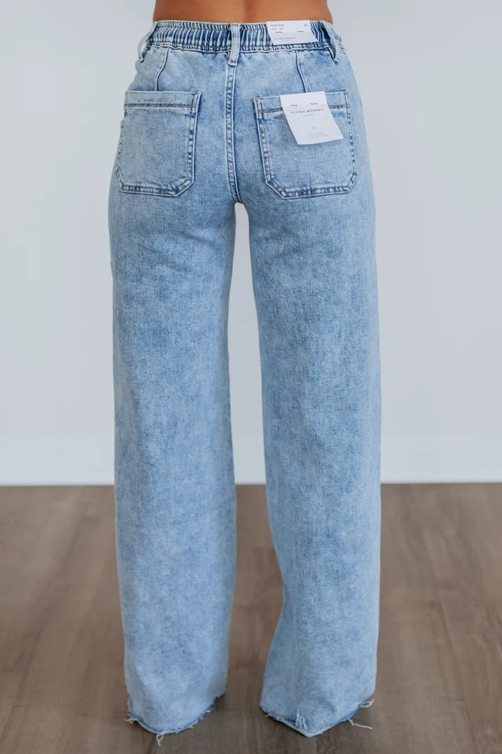 The high-rise waistband includes a functional white drawstring, letting you adjust the fit to your liking, while the roomy wide-leg silhouette skims the hips and falls to a full-length, frayed hem for a relaxed, modern vibe. The front patch pockets add a utilitarian touch, and the stretchy denim blend ensures all-day comfort whether you’re running errands or meeting friends for brunch.